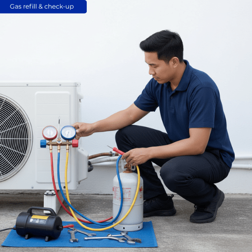 We refill the AC gas for optimum cooling performance. Any required spare parts are provided at fixed, transparent rates — or you’re free to source them yourself.